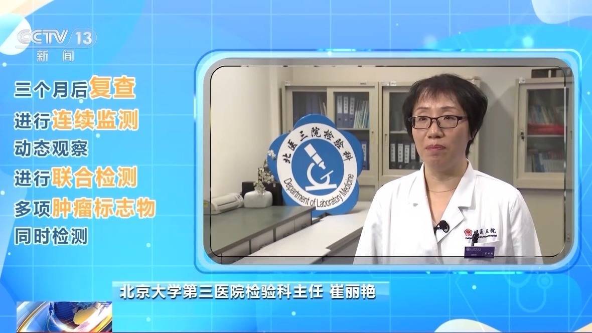 北京大学第三医院检验科主任 崔丽艳:从指南的建议来说,要求是正常参考区间上限的两倍以上,两倍以下不需要太紧张。假如是两倍以上,第一,需要一般三个月之后进行复查;第二,一般需要进行连续监测,动态观察;第三,需要联合检测,多项肿瘤标志物同时检测。
