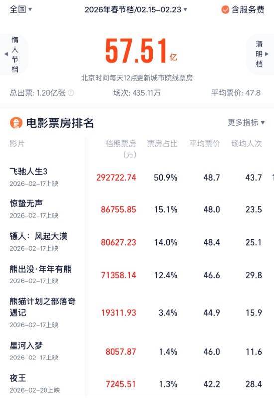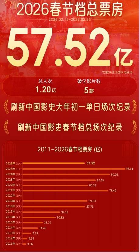 据国家电影局统计,截至2月24日9时,2026年春节档总票房达57.52亿元,总观影人次1.2亿,而放映总场次突破435万场,刷新中国影史春节档总场次最高纪录。